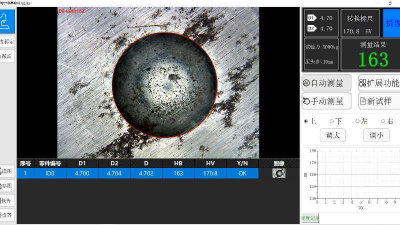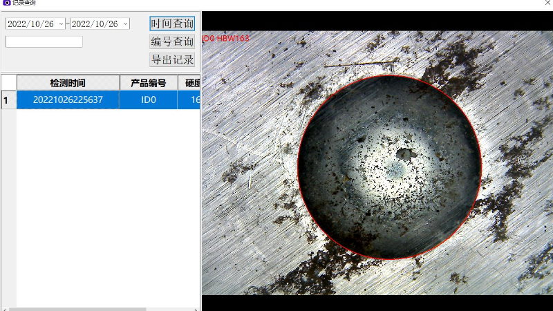 測量完成後(hòu)主界麵顯(xiǎn)示(shì)壓痕區域會縮小,所測(cè)量的壓痕(hén)列表會(huì)出現在壓痕圖像區域的下方
