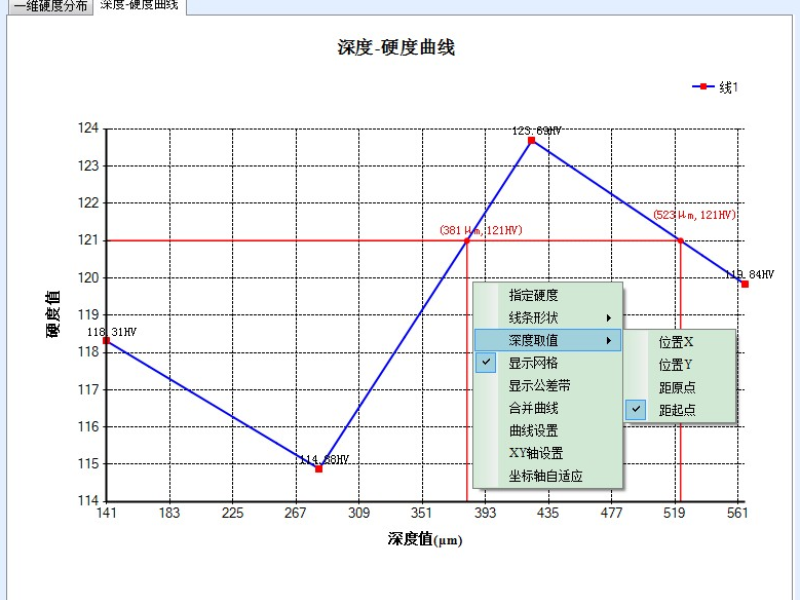 測量結果按路徑序列排列,生(shēng)成(chéng)相應的硬化層深度(dù)值(zhí)及(jí)硬度變化曲線圖(tú)。 |