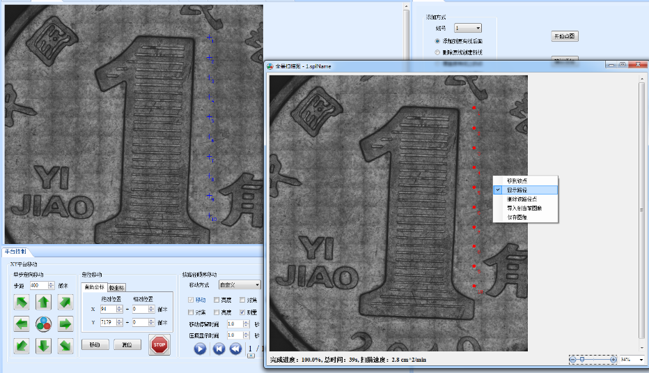 軟(ruǎn)件界麵右鍵菜單提供了,移到(dào)該點、顯示(shì)路徑、刪除選中路徑點、導入當前圖像、保存(cún)圖像等功能。