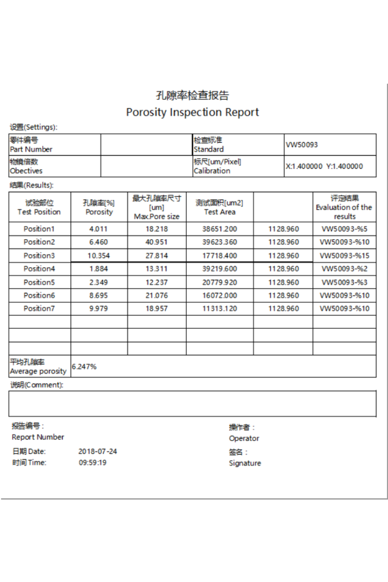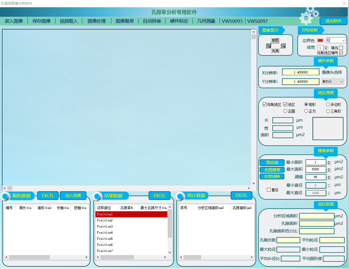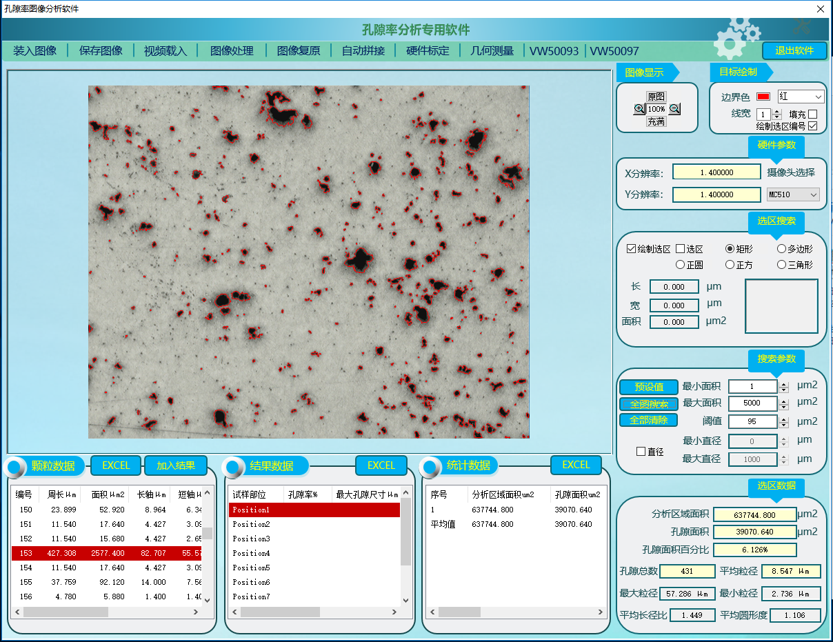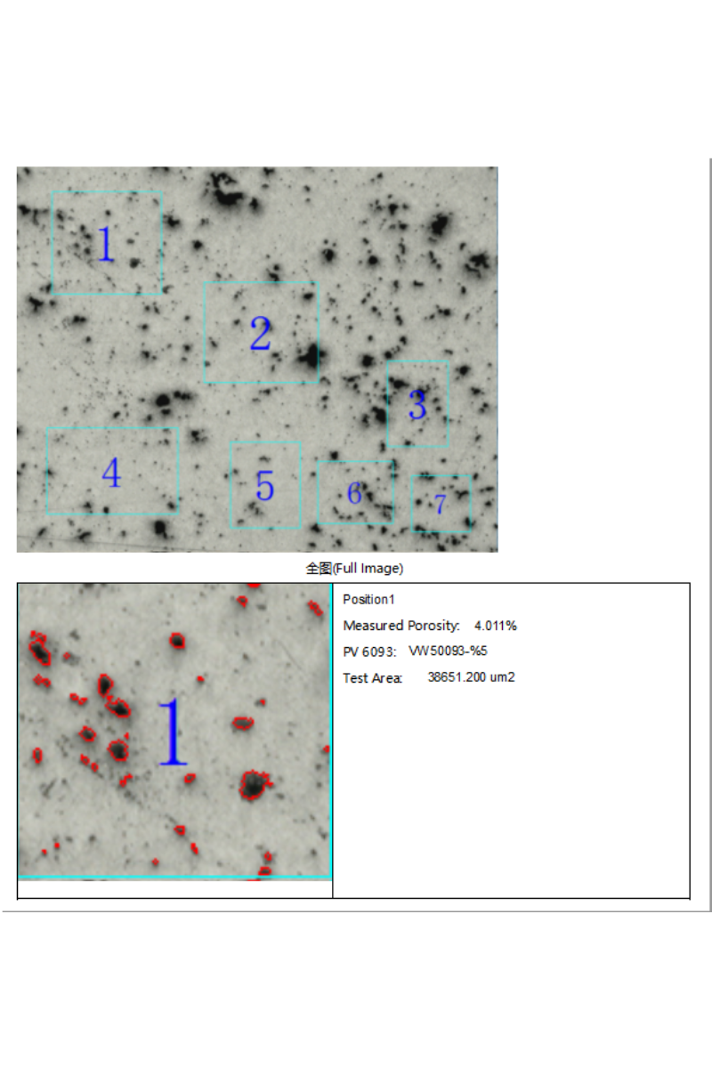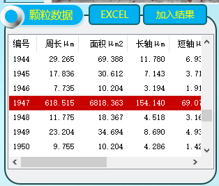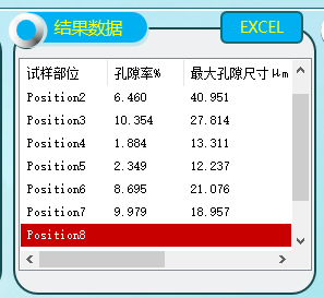 結果列表(biǎo):預置了10個部位列表位(wèi)置,每分析完一個選區的數據,就可加入(rù)到一個部位數據行,並(bìng)算出(chū)孔(kǒng)隙率、最大孔隙尺寸、測試麵積等參數。