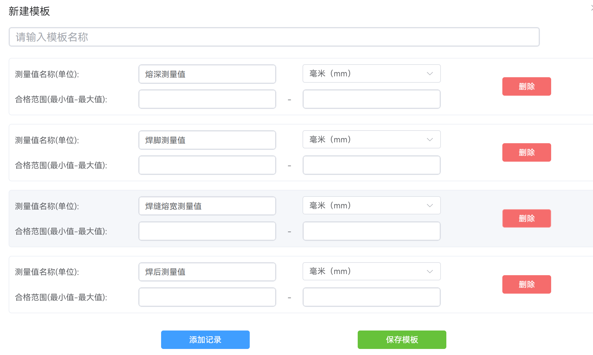 3、檢測模板自定義;焊縫熔深、焊縫寬(kuān)度、焊(hàn)縫餘高、氣孔直徑、焊接(jiē)氣孔,夾渣等企業可以自定(dìng)義檢測項目,同時可以設置OK/NG判斷值,行程企業(yè)專屬的(de)檢測模板。